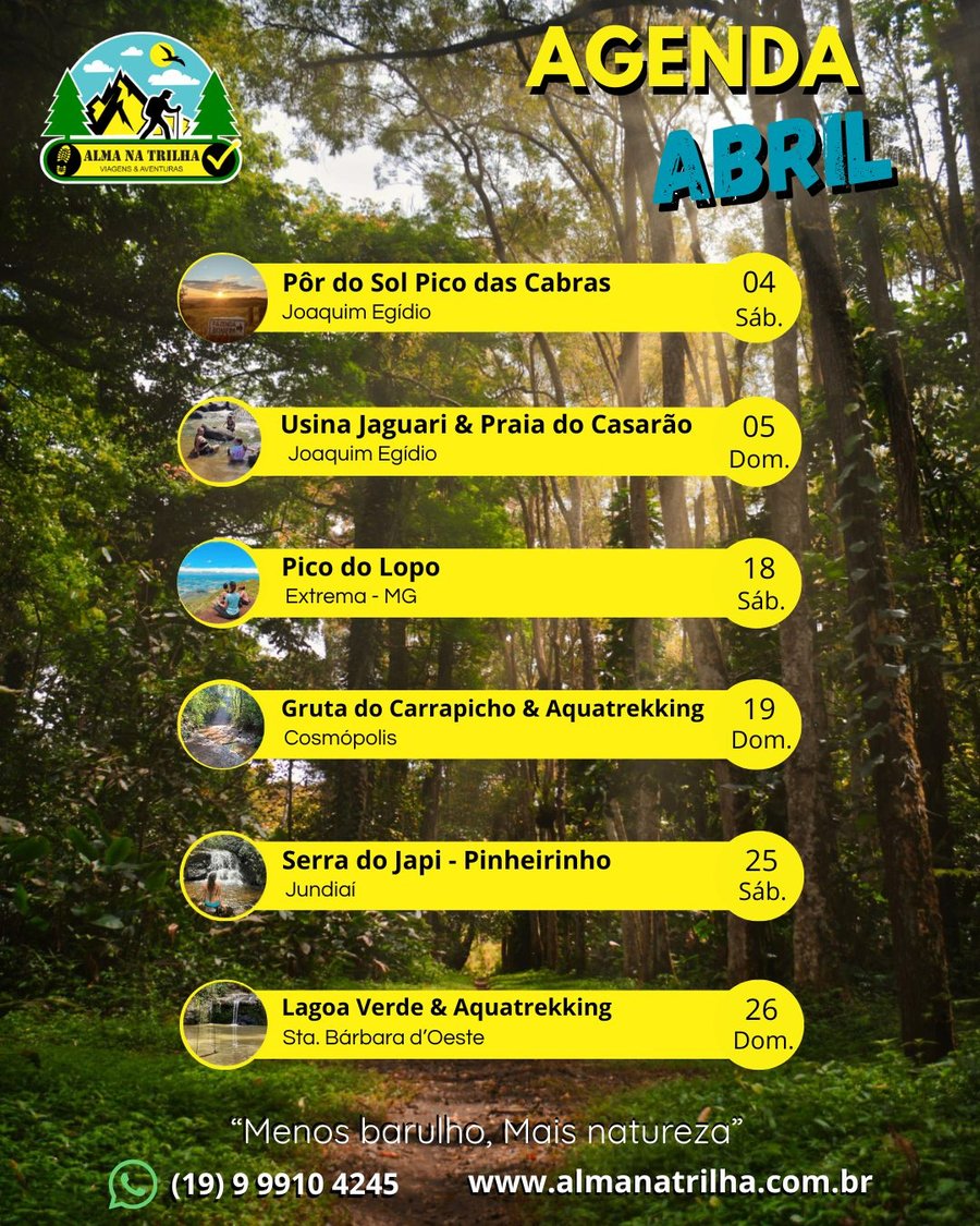 Seja você turista em busca de aventura 🧭 ou morador querendo redescobrir a região de Campinas 🌄, a Alma na Trilha tem o passeio ideal. Com guias experientes e apaixonados por trilhas 🥾🌿, proporcionamos jornadas de descobertas, contato com a natureza e experiências únicas ✨ para criar memórias que ficam para a vida toda 💚📸.