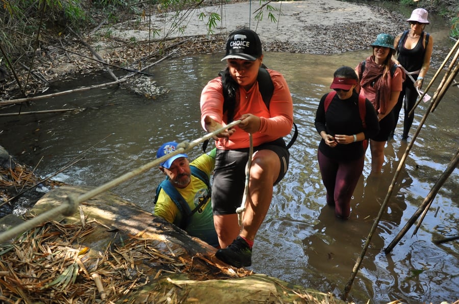 Durante a trilha molhada, é necessário descer barrancos para acessar o trajeto, que contém terreno irregular com pedras, e a água pode chegar até a cintura 💦. Há etapas de subidas que exigem o uso de cordas e trechos escorregadios com muita emoção.