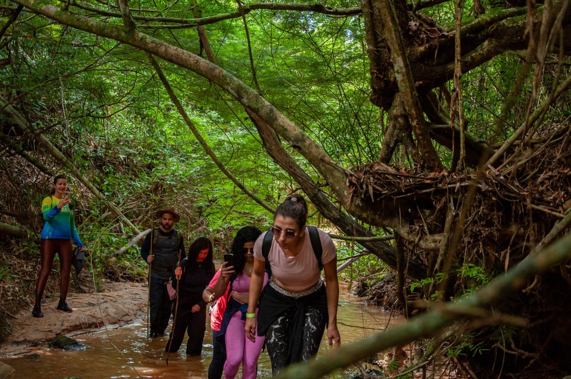 Durante a trilha molhada, é necessário descer barrancos para acessar o trajeto, que contém terreno irregular com pedras, e a água pode chegar até a cintura 💦. Há etapas de subidas que exigem o uso de cordas e trechos escorregadios com muita emoção.